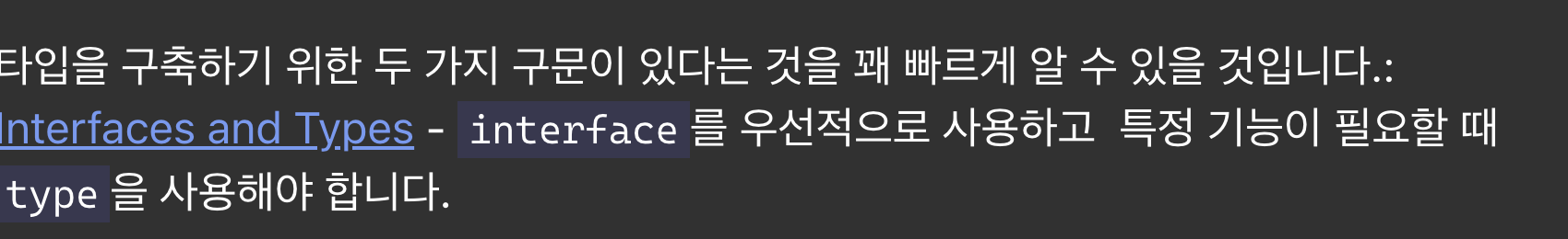 - typescirpt 공식문서에서는 일반적인 상황에서는 Interface를 사용하는 것을 추천한다.