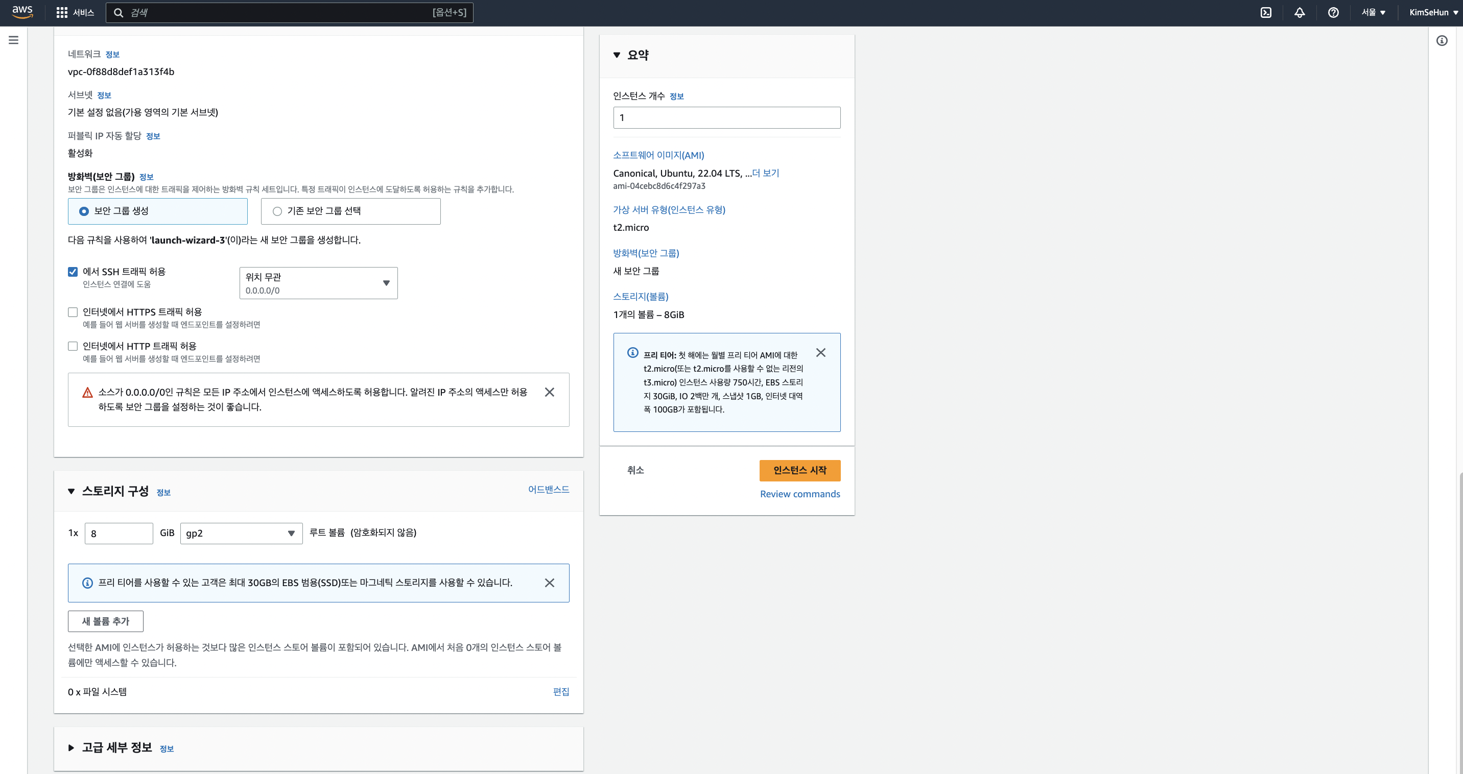 - 인스턴스 유형 또한 프리티어가 무료로 사용할 수 있는 t2.mico를 사용하였다.