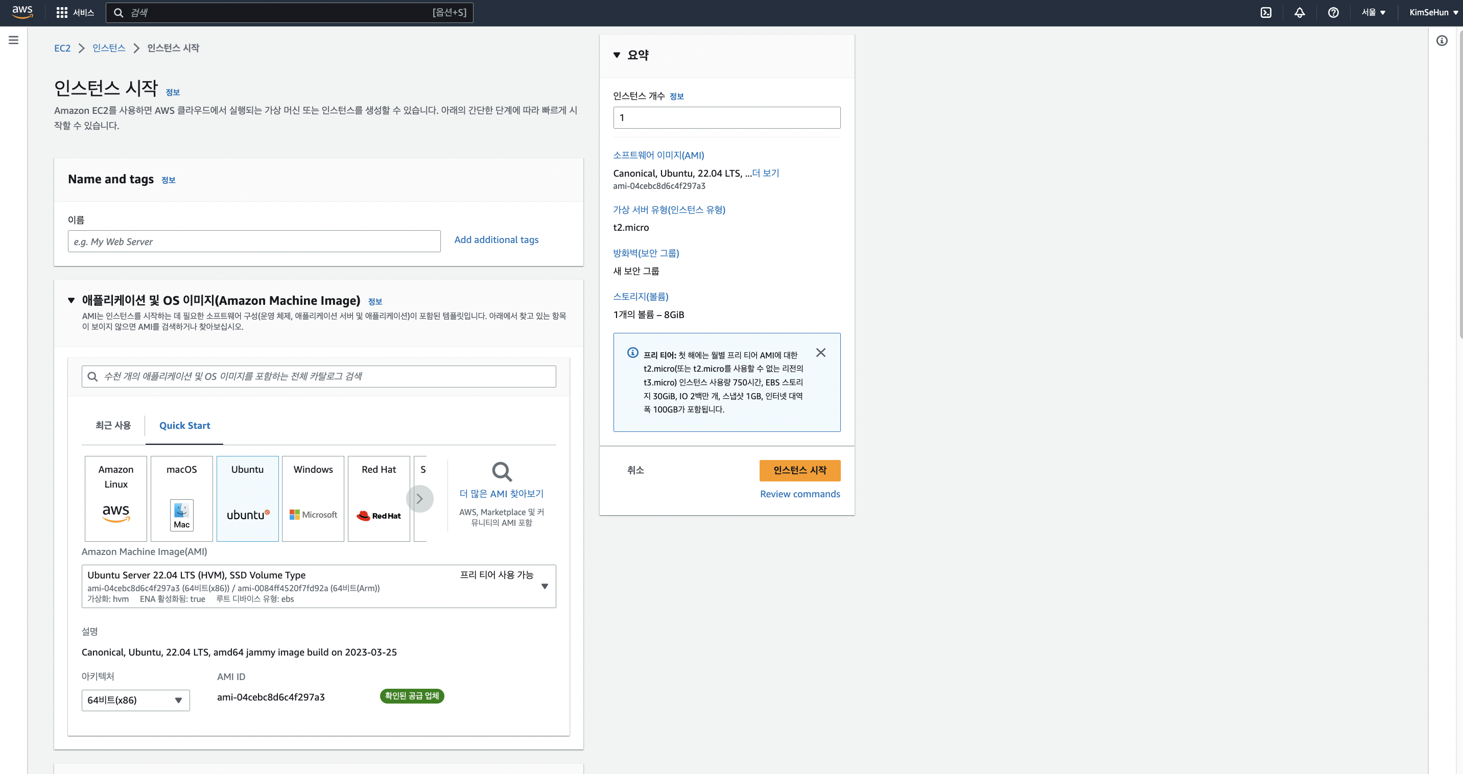 - 나는 Ubuntu를 사용하여 진행하였고 AMI는 프리티어가 무료로 사용할 수 있는 ubuntu server 22.04 버전을 사용하였다.