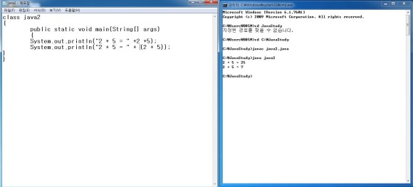 두 번째 Systemouprintln에서는 괄호 안의 +(2 +5 )는 계산이 되어