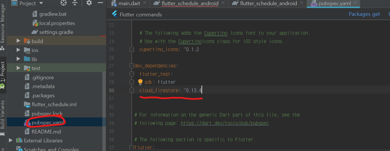 그 후 FIrestore를 이용하기 위해 cloud_firestore 라이브러리를 추가해 줍니다.