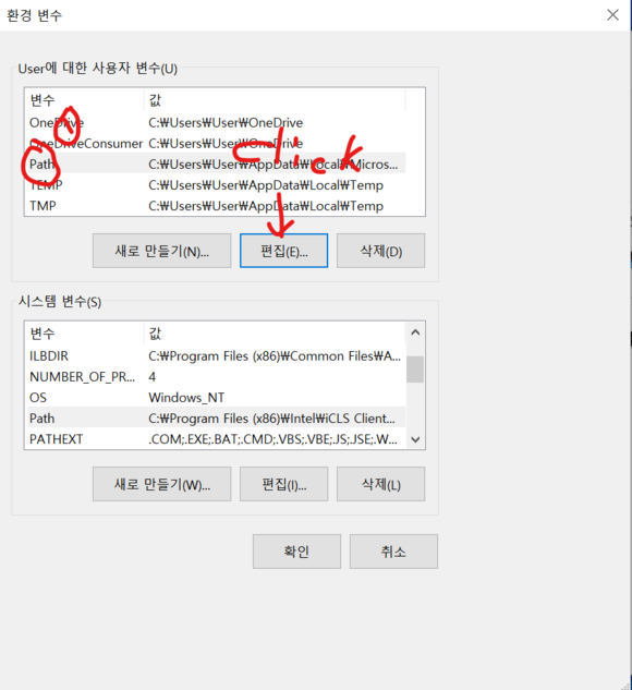 User 사용자변수에 Path를 선택한뒤 편집을 클릭히시고