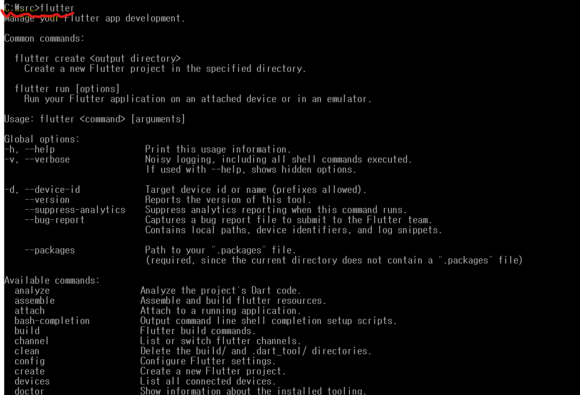 cmd실행->sdk파일 경로지정(cd명령어이용)->flutter을 입력하면