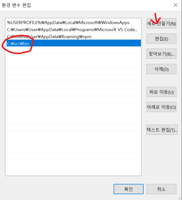 압축을 풀어주었던 sdk파일의 bin 폴더의 경로로 새로만들어줍니다.