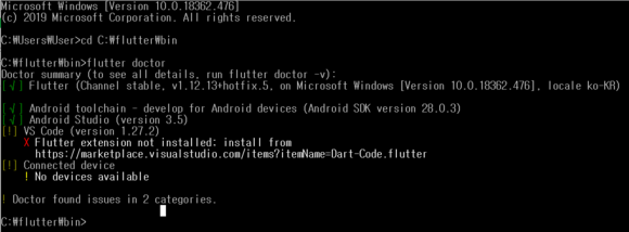 cd명령어를 활용해 sdk파일 bin폴더로 지정한 뒤 flutter doctor를 입력한다.