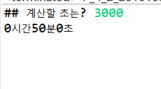 4.System.out.print("## 계산할 초는?"); // 질문을 출력 text=keyboard.nextInt(); // 입력값을 text라고 선언 hour=text/3600; // 입력값을 시간으로 변환하는 공식 minute=(text%3600)/60; //입력값을 시간으로 변환하고 남은 값을 분으로 변환 second=text%60; //나머지를 초로 변환