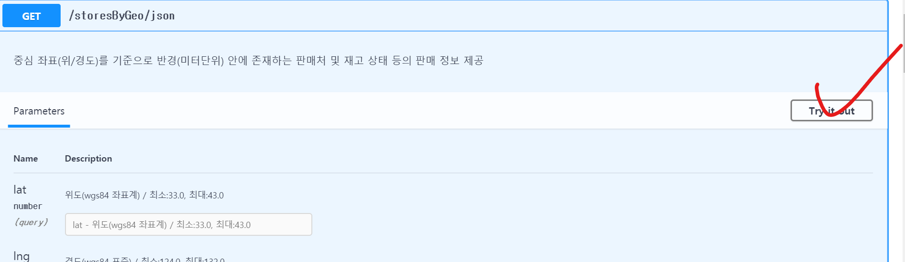 해달 링크에 접속하셔서 원하는 JSON을 클릭하신 후 Try it을 클릭하시면 url을 확인할 수 있습니다.