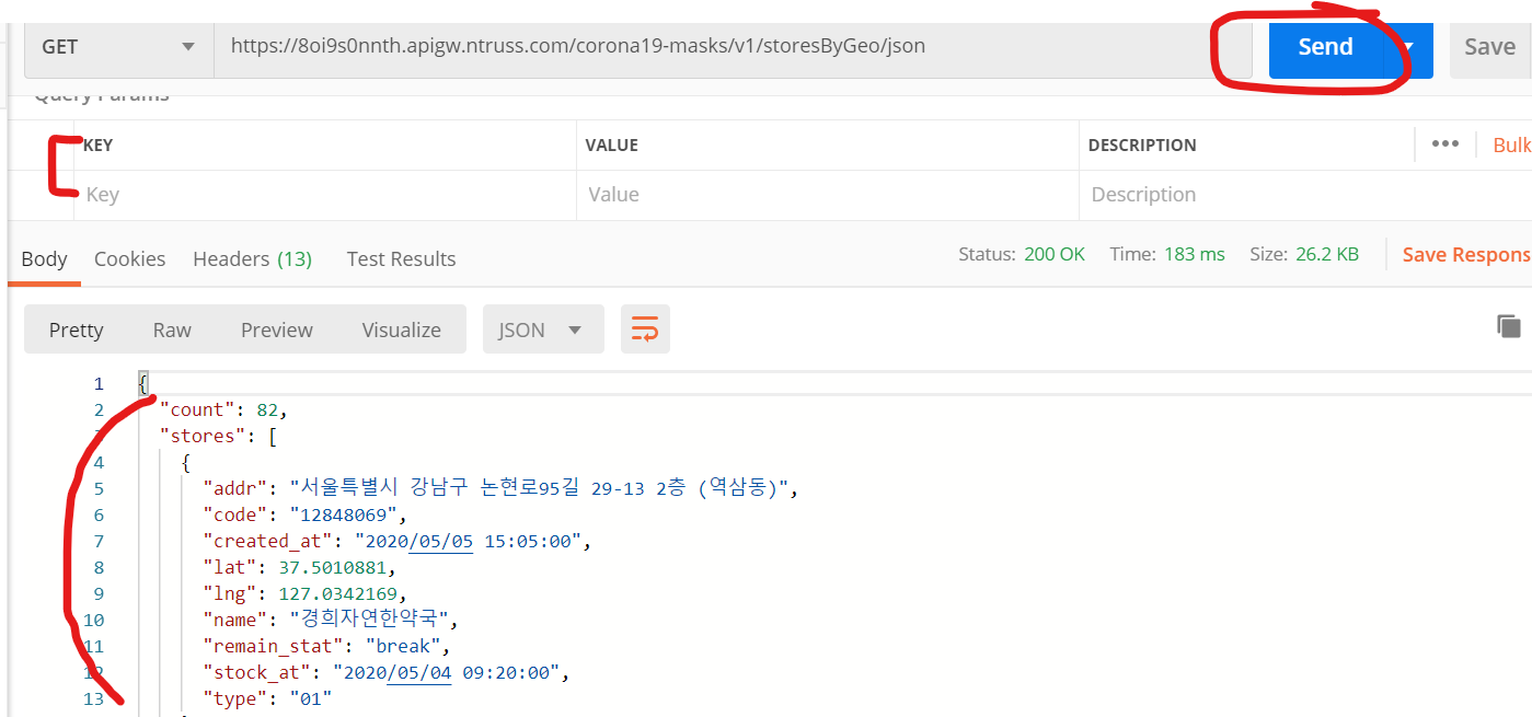 저는 공적 마스크 판매 현황 API를 테스트해보겠습니다.