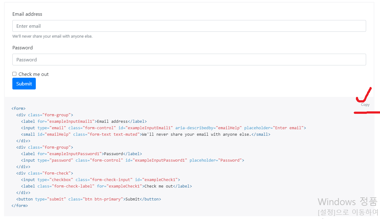 저는 예시로 Documentation -> Components ->Forms에 있는 위의 코드를 복사 붙여넣기 한다.