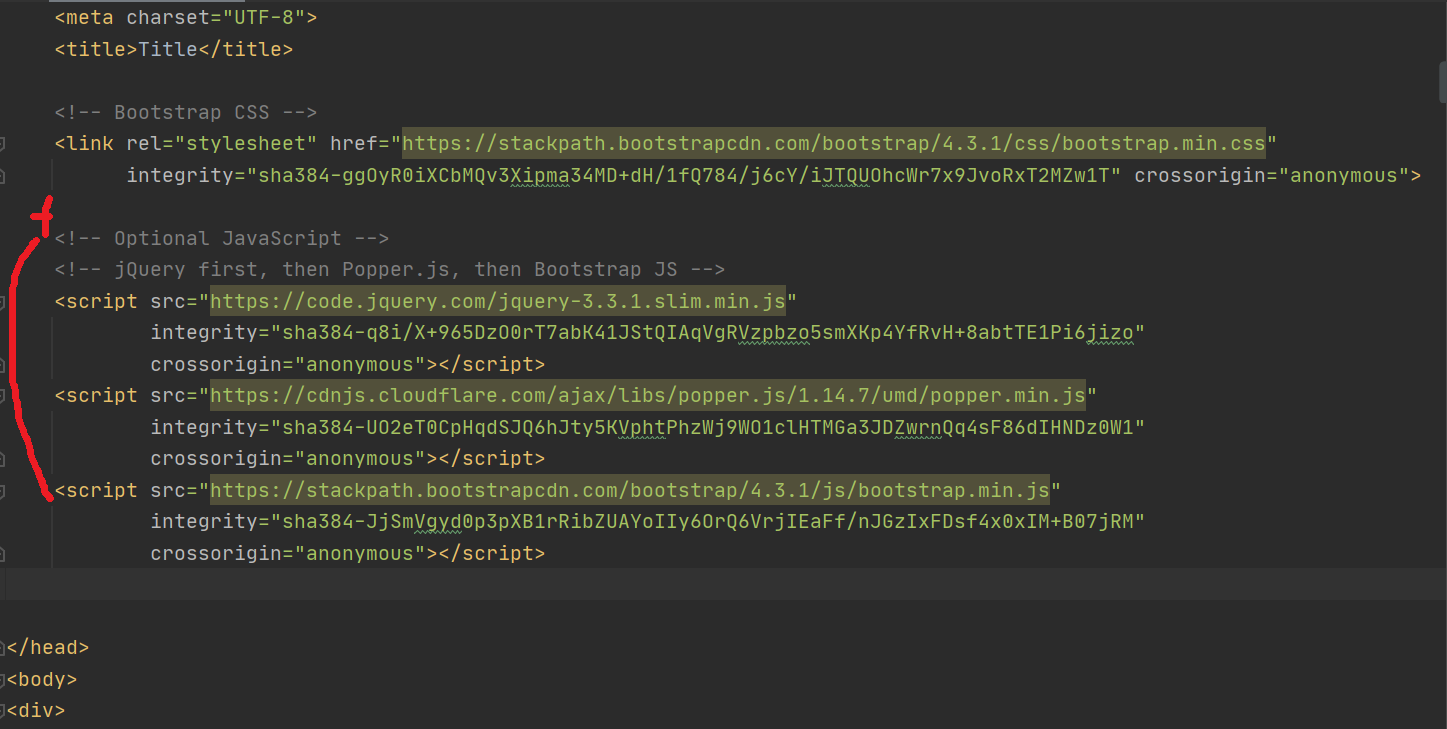 2. jquery와 popper.js를 사용하기위하여 다음 코드를 마찬가지로 <head>사이에 입력해 준다.