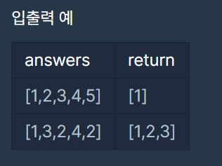 1번 문제부터 마지막 문제까지의 정답이 순서대로 들은 배열 answers가 주어졌을 때, 가장 많은 문제를 맞힌 사람이 누구인지 배열에 담아 return 하도록 solution 함수를 작성해주세요.