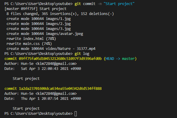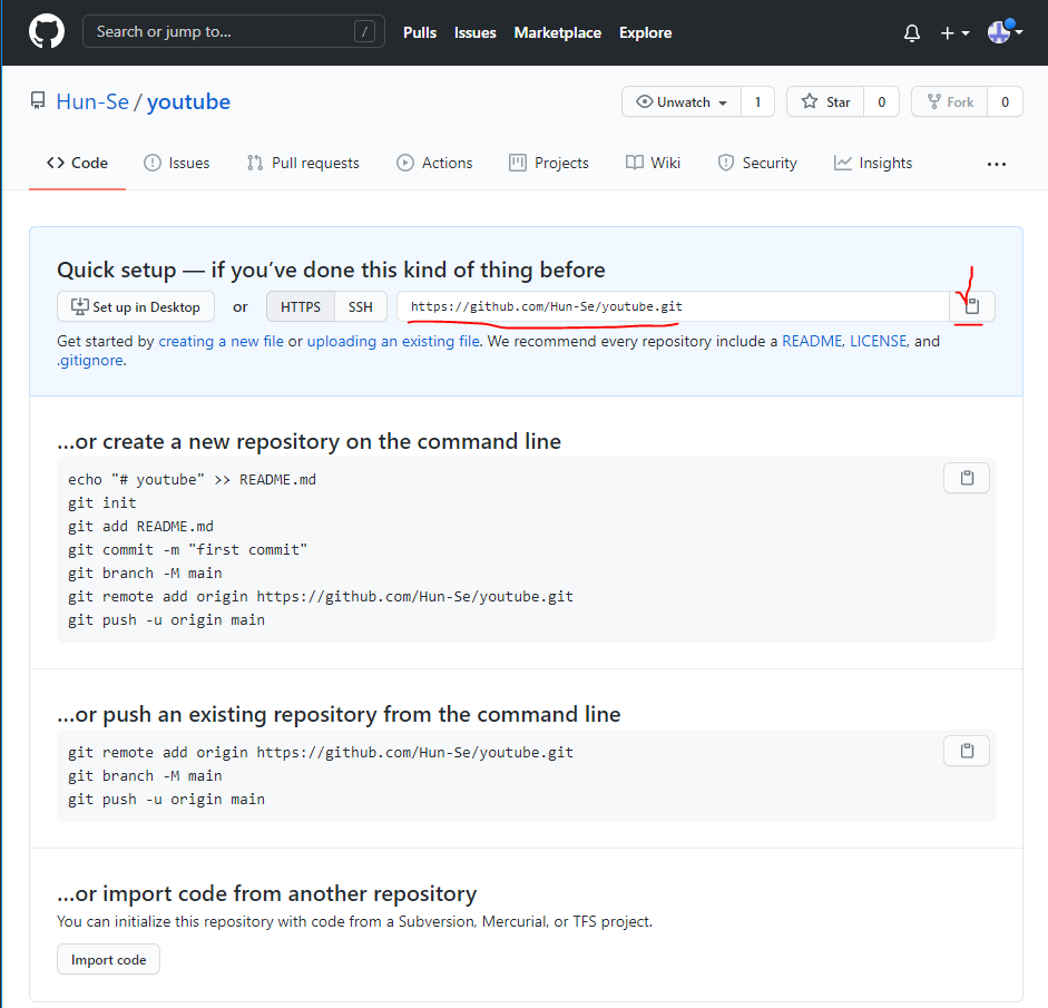 ex) git remote add origin 복사한 주소 http://github.com/Hun-Se/youtube.git