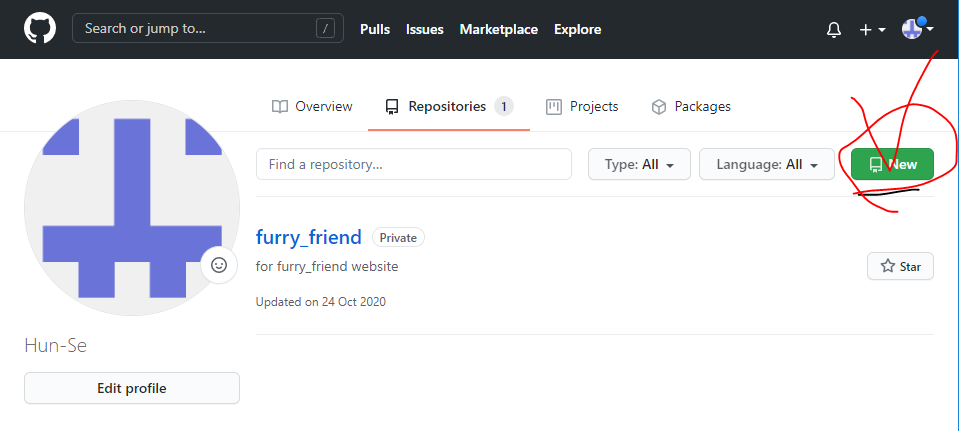 GitHub 홈페이지에 접속하여 로그인 후 New를 클릭해서 새로운 Respositories를 생성해준다.