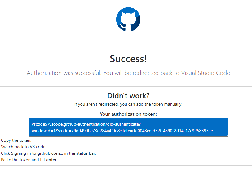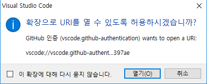 그러면 vs코드에서 다음과 같은 화면이 나오는 링크를 연결해주는데 이는 github 업로드하기 위하여 로그인으로 업로드할 수 있는 권한을 인증 한기 위함이다.