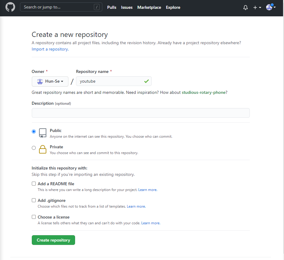 이름, 공개, 비공개 등 설정해 주고 Create repository를 클릭한다.