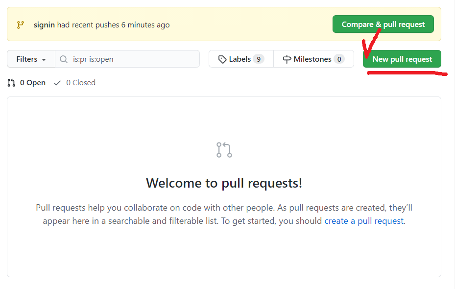 master와 branch를 병합하기 위하여 Pull requests -> New pull request로 접속한다.
