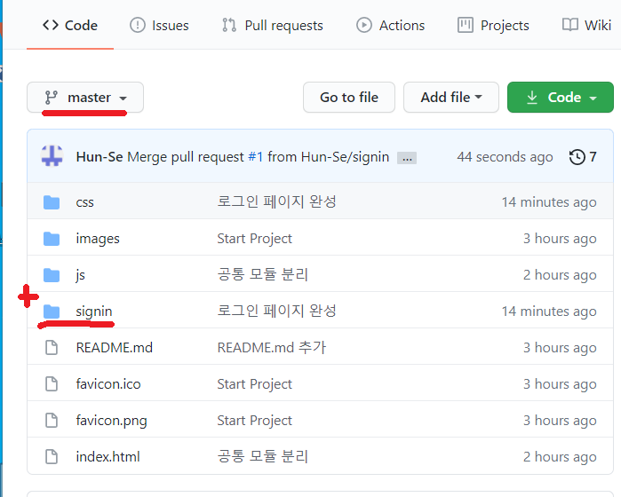 위 이미지와 같이 Create pull request, Merge pull request, Confirm merge를 차례대로 클릭해주면 master와 branch가 병합되어서 branch에서 변경한 내용이 master에 반영된다.