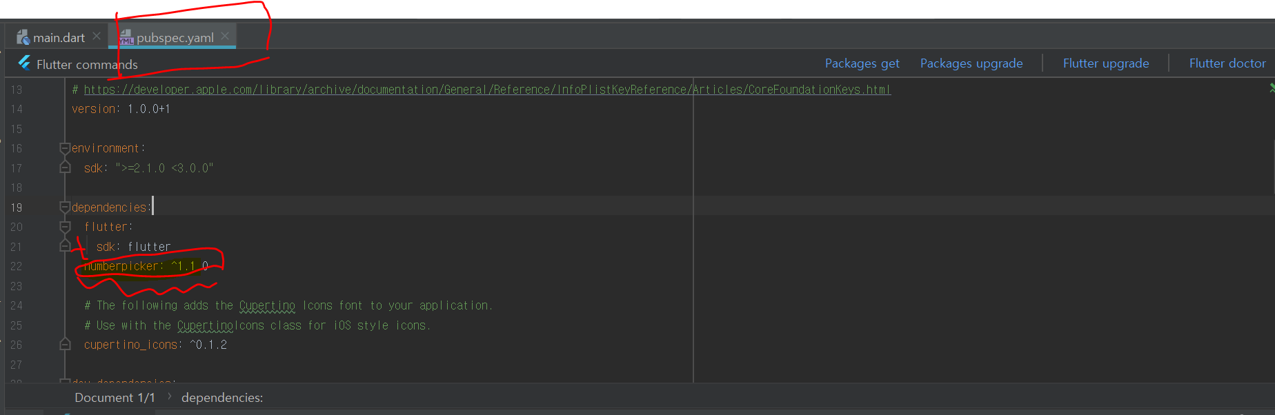 이때 numberpicker: ^1.1.0의 라인을 flutter:와 맞춰 줘야 합니다. sdk 라인에 맞춰지면 오류가 생깁니다!