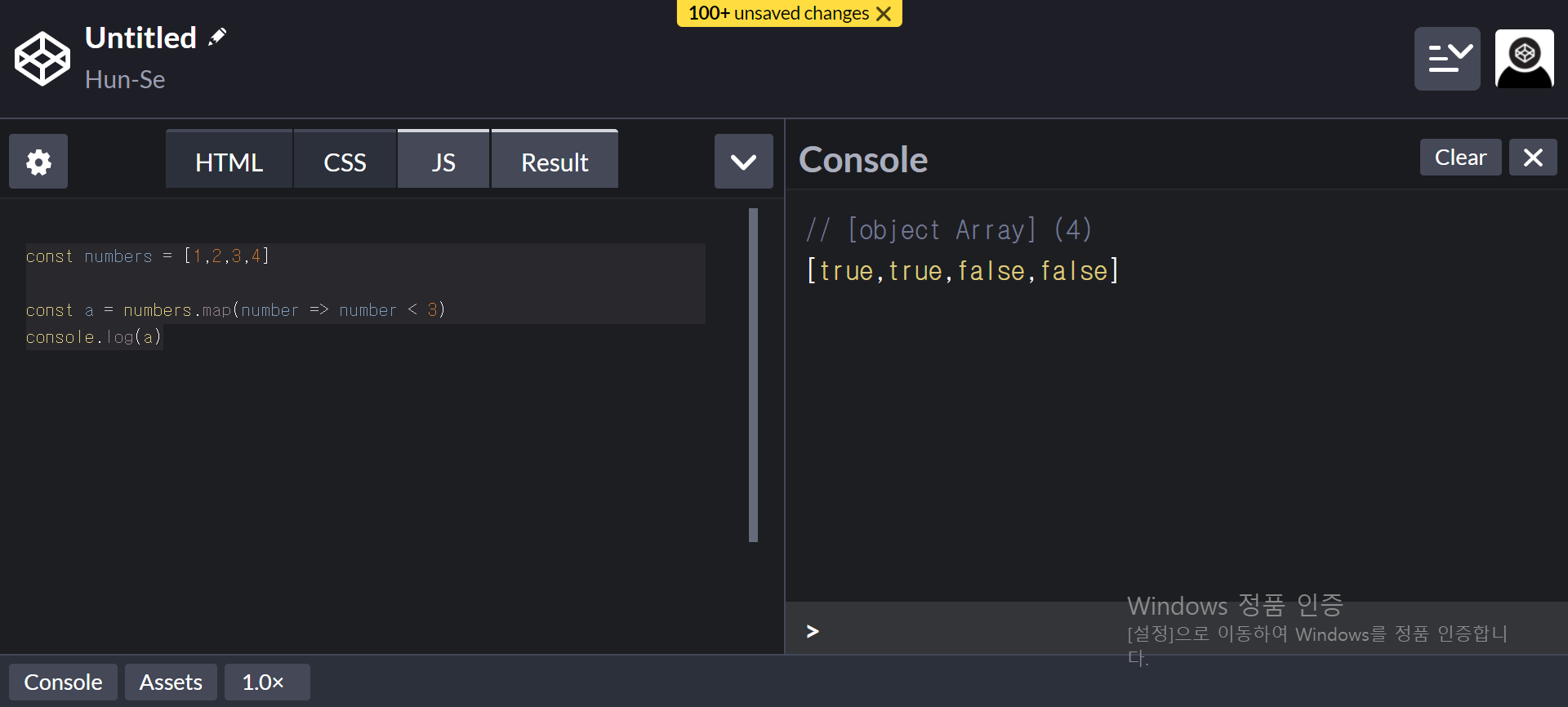 numbers의 값인 [1, 2, 3, 4]에서 값이 조건 3미만(<3)에 true이면 리턴되고 false이면 리턴되지 않는다.