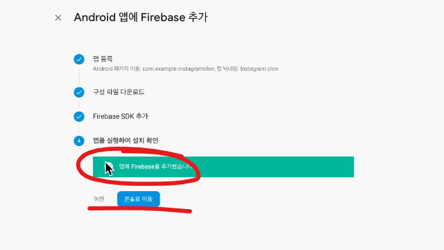 6. 마지막으로 firebase추가를 클릭하면 연동 끝!