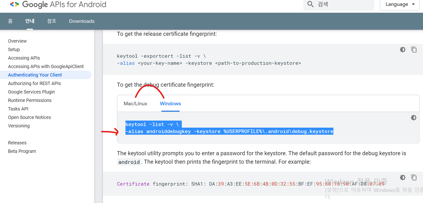 본인의 운영체제에 맞는 keytool -list -v -keystore debug.keystore명령어를 복사 후 CMD에 붙여 넣기 해서 실행해 줍니다.