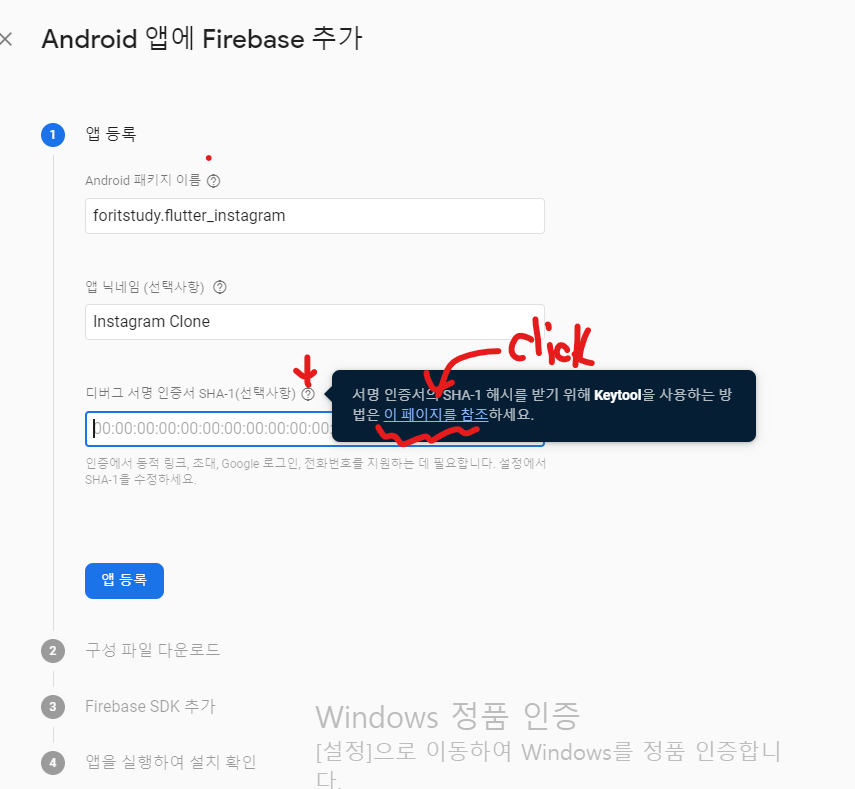 4. 안드로이드의 패키지 이름과 원하는 앱 닉네임을 적어주고 디버그 서명 인증서를 입력해줘야 합니다.