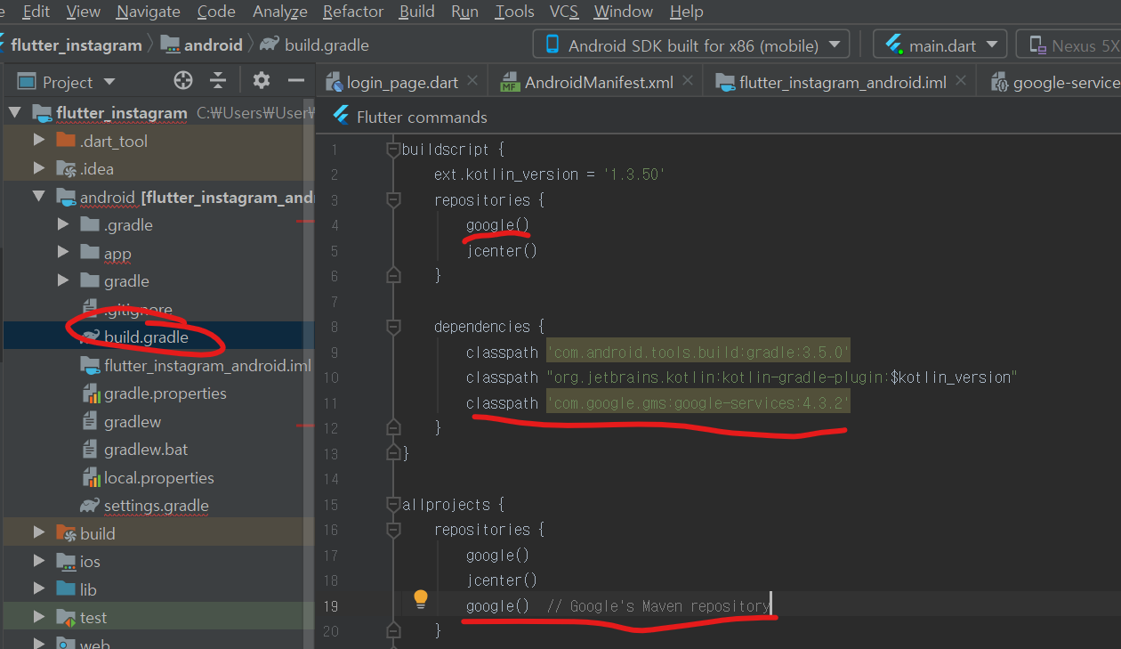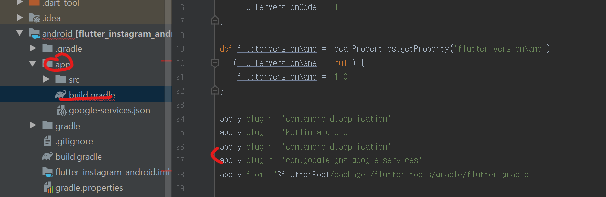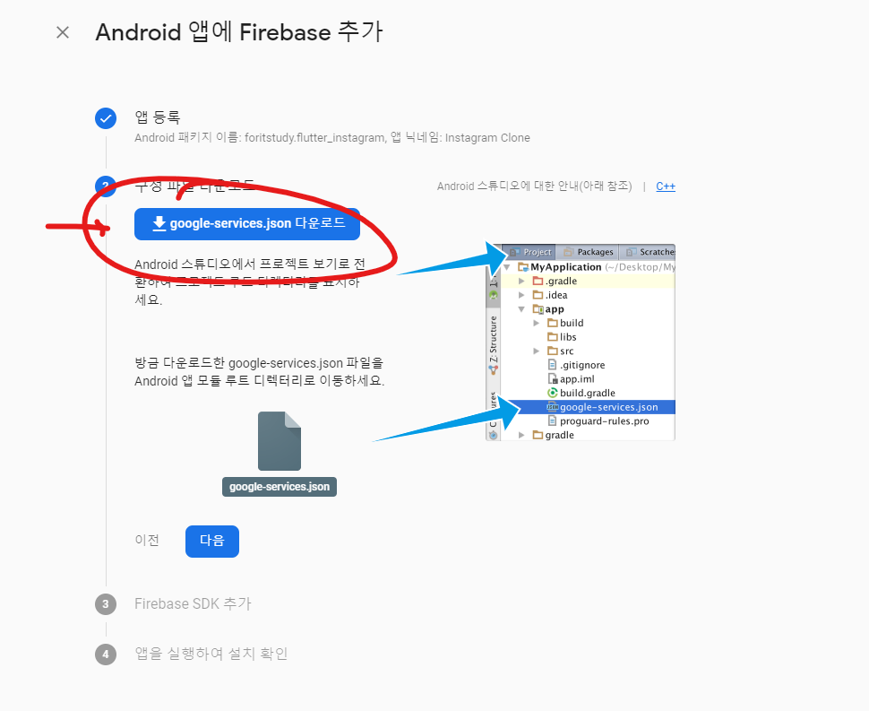 5. 그 후 google services.json을 다운로드한 후 firebase를 연동하고 싶은