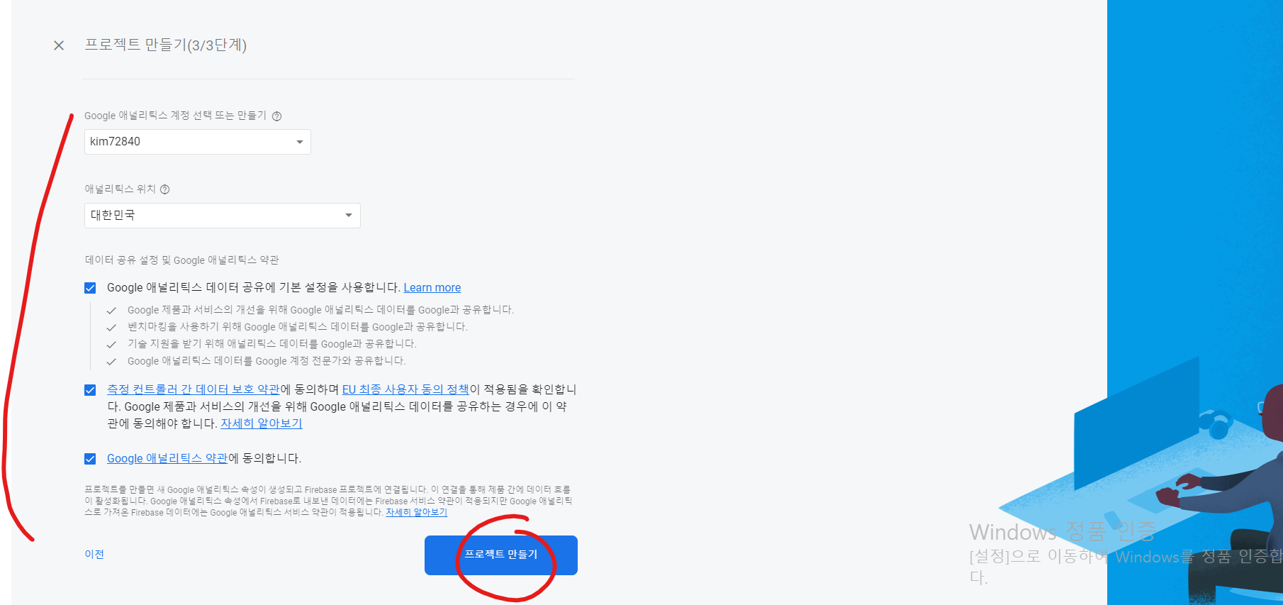2. 원하는 아무 프로젝트의 이름을 입력해주고, Google 에널리틱스 계정, 위치를 입력해주고 체크박스에 체크 후 새 프로젝트 만들기를 클릭합니다.