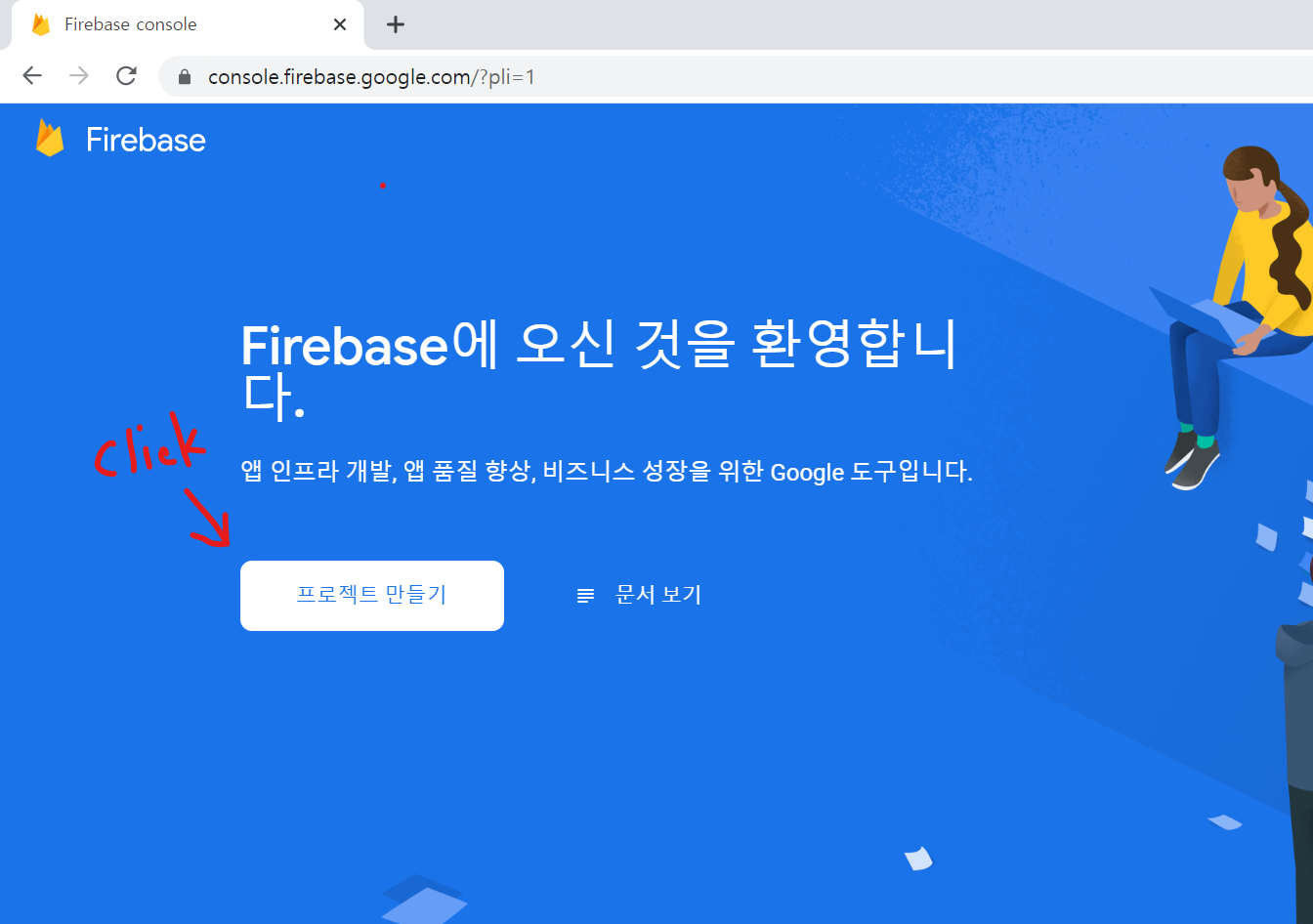 1. 우선 위의 링크를 클릭하여 파이어 베이스 홈페이지로 이동한 후, 프로젝트 생성을 눌러줍니다.