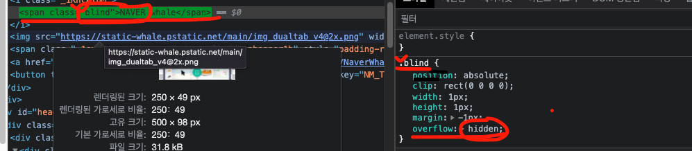 네이버와 다음의 홈페이지를 개발자 도구를 살펴보면 .blind 선택자와 .screenout 선택자에는 다음과 같이 overflow:hidden; 프로퍼티가 적용된 부분을 확인할 수 있다.